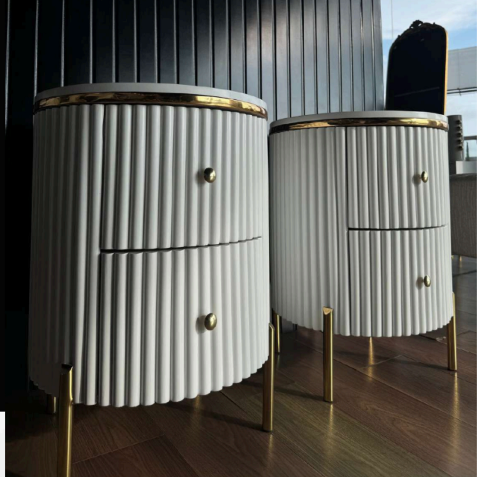 Burós Circle: Un diseño redondo y vanguardista. Presentan un cuerpo acanalado en blanco, elegantes detalles dorados en el borde superior, tiradores a juego y patas metálicas cónicas. La pieza ideal para un estilo art déco moderno.