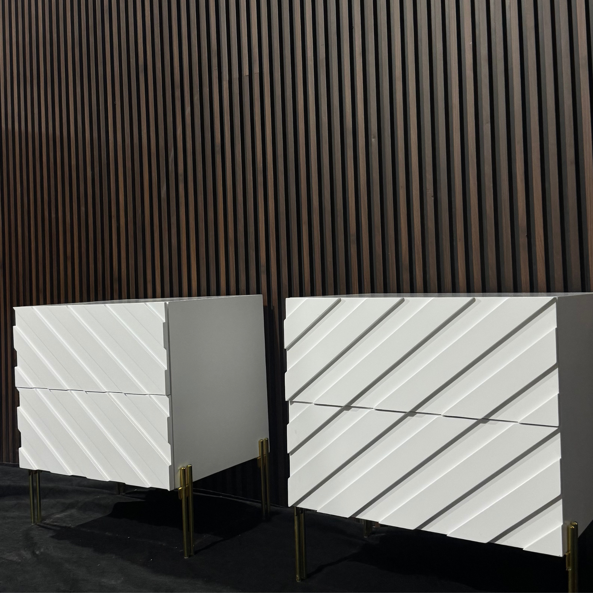 Buró Iconic: Elegancia moderna con textura. Este buró cuenta con dos cajones de diseño estriado diagonal y sofisticadas patas metálicas doradas. El toque chic y funcional que tu habitación necesita.