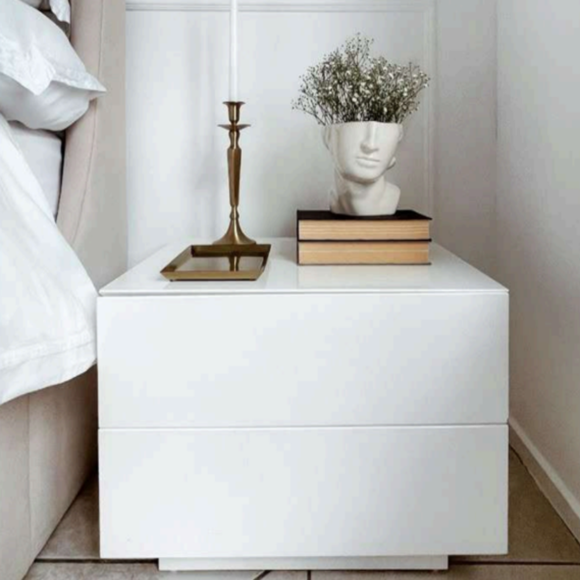 Buró minimalista en blanco de alto brillo con dos amplios cajones. Su diseño limpio y moderno es perfecto para un estilo sofisticado y una organización discreta en tu dormitorio.
