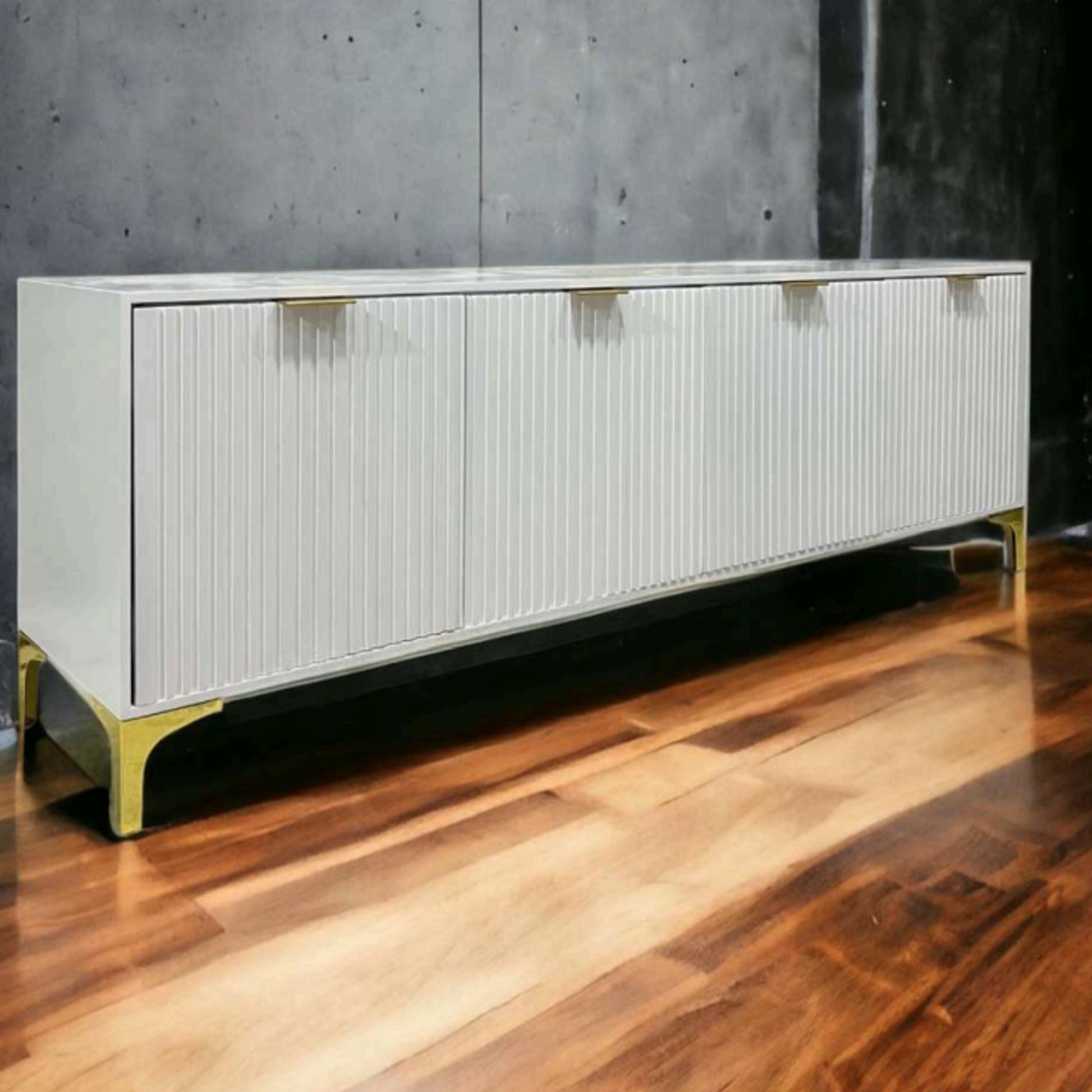 Mueble de TV Mar: Textura y estilo contemporáneo. Este mueble alargado combina un elegante diseño acanalado en sus puertas con patas angulares metálicas en tono dorado, proporcionando un punto focal moderno y amplio espacio de almacenamiento