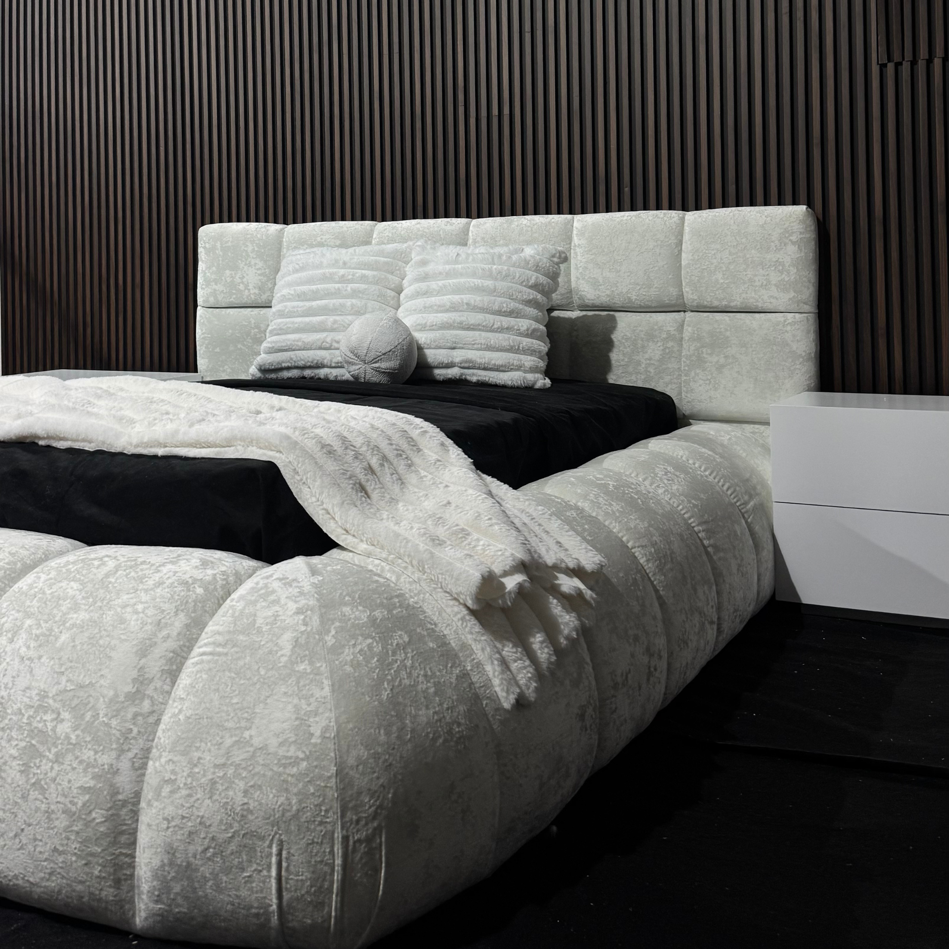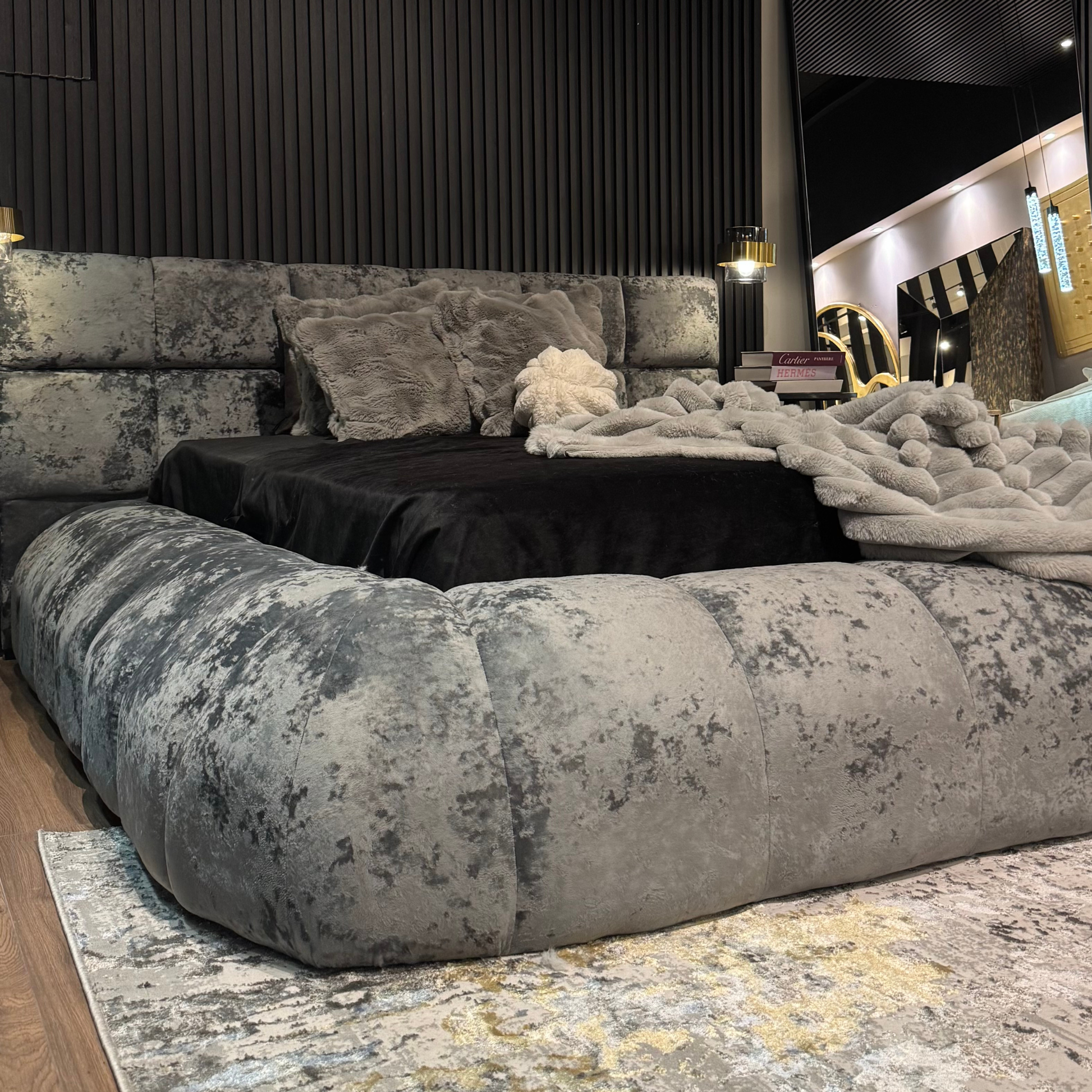 Diseño de cama de alto impacto, tapizada en terciopelo suave y profundo. Destaca por su cabecero voluptuoso con patrón de esferas o "burbujas" y una base con detalles de canales verticales, creando una textura rica y un estilo lujoso y dramático.