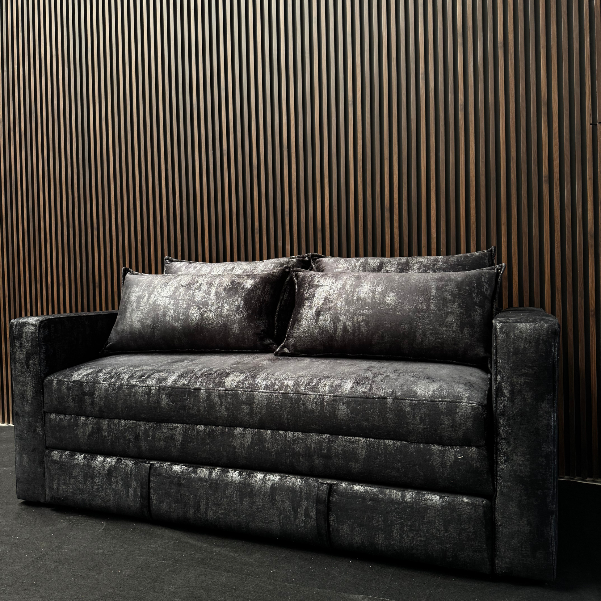 Sofá Cama Cloud: Estilo industrial-chic y funcionalidad. Este sofá cama se distingue por su tapizado en una tela texturizada oscura con un acabado metalizado o desgastado, ofreciendo un look moderno y audaz. Se transforma fácilmente para brindar un descanso extra sin sacrificar el diseño."